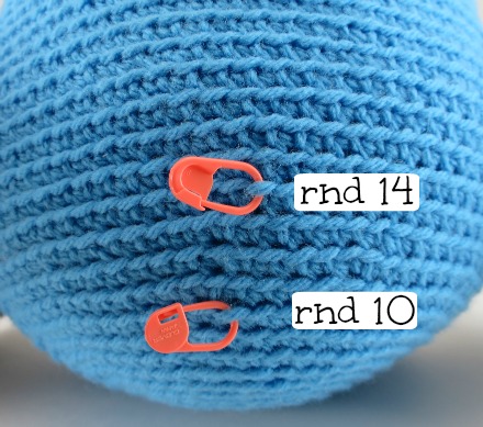With almost all amigurumi patterns, you need to attach smaller pieces onto larger pieces by sewing them together. Most often people will suggest to use normal straight pins to prevent a piece from migrating across your ami’s body as you are trying to sew it in place, but when you crochet through the back loops only, I find stitch markers are a better choice.